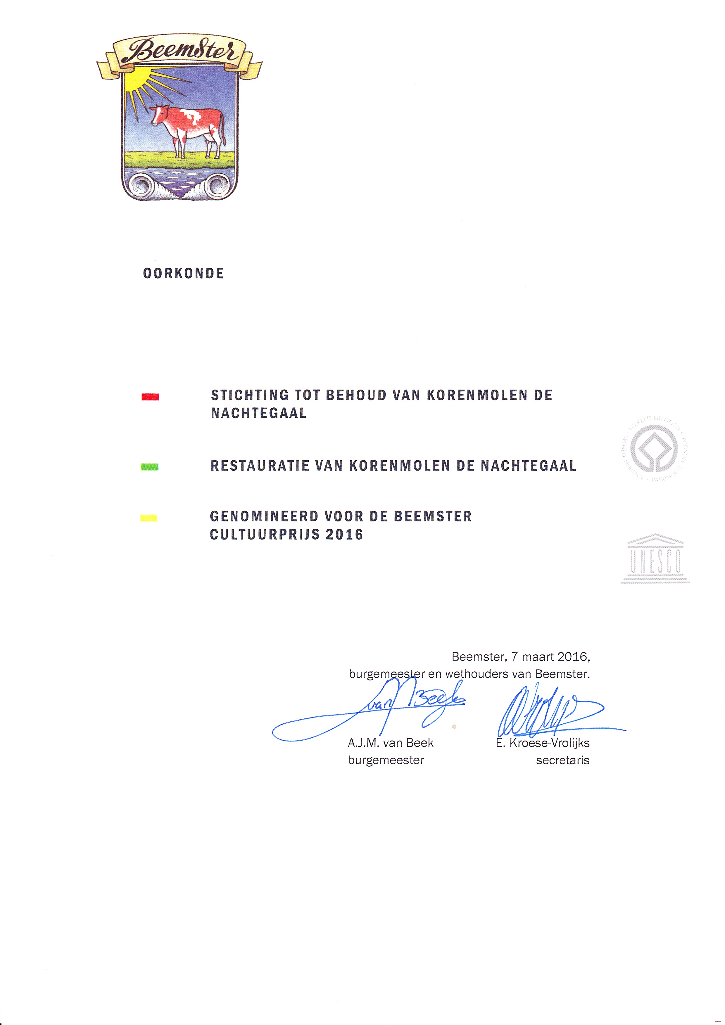 Stichting tot behoud van De Nachtegaal was, samen met drie andere Beemster organisaties, genomineerd voor de Cultuurprijs 2016 van de Gemeente Beemster.